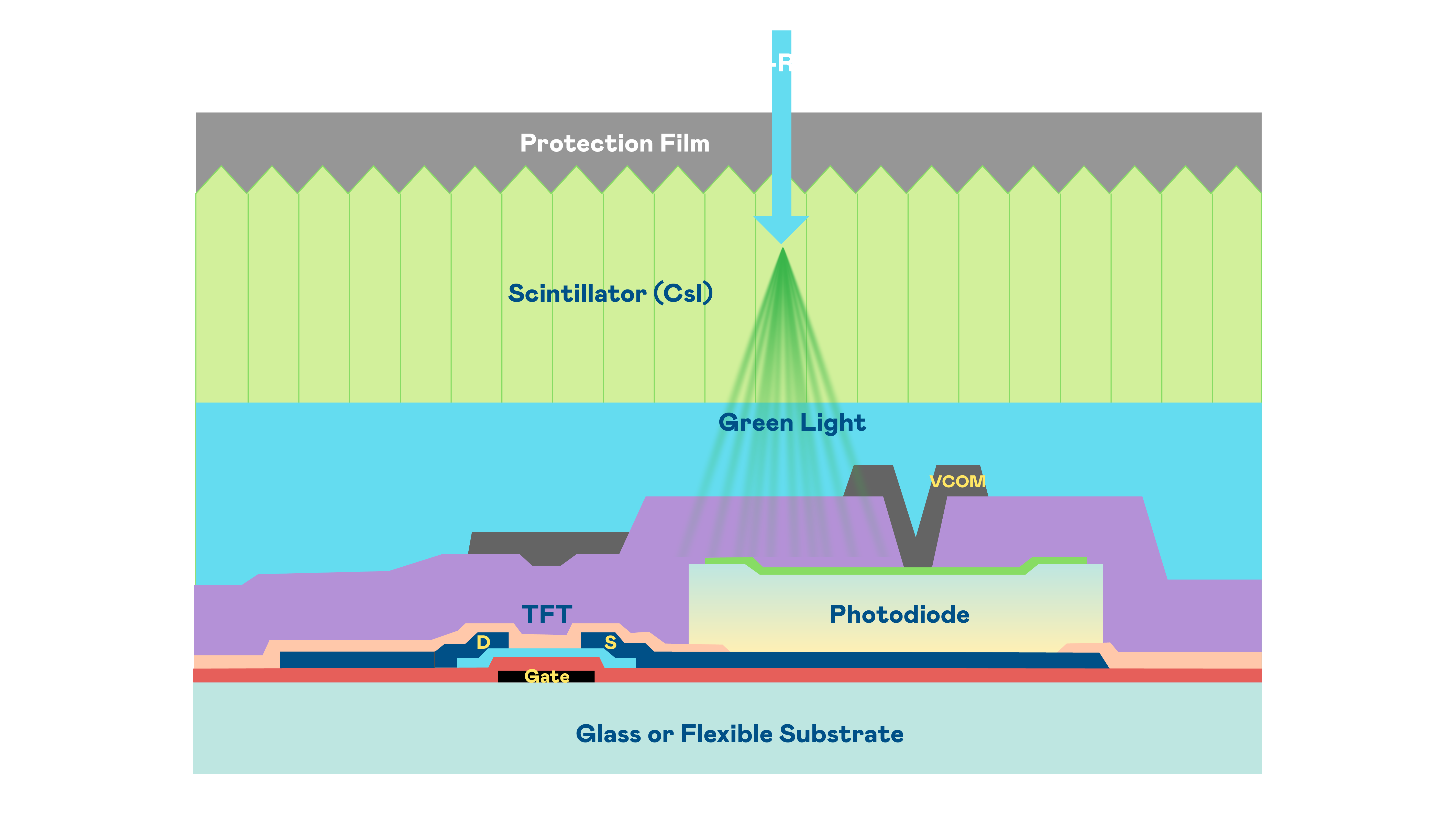 CG电子的X光影像感测阵列使用薄膜电晶体 (TFT) 作为每个像素的读取开关,搭配光电二极体(Photodiode)的光电转换元件,用以感测X光影像讯号。
